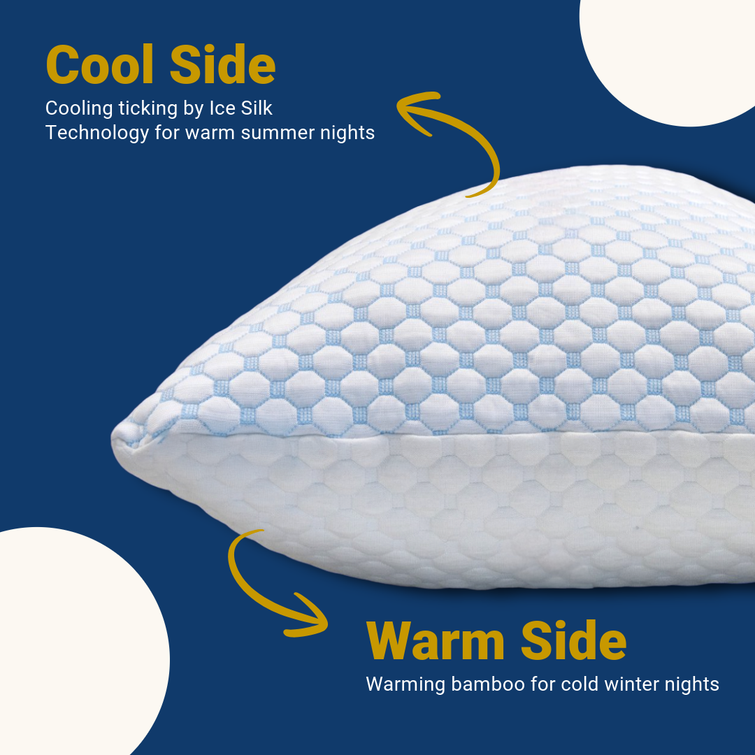 Designed with two distinct sides: a blue side crafted from Ice Silk for a refreshing, cool touch, and a white side made from bamboo fabric offering warmth and softness. This dual-sided design allows you to select your preferred comfort level, ensuring a restful sleep in any season.